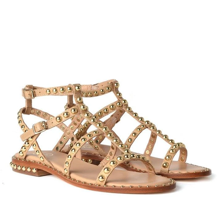 Gold leather precious studded sandals from ASH featuring gold-tone stud detailing, open toe, buckle-fastening ankle strap and strappy design.