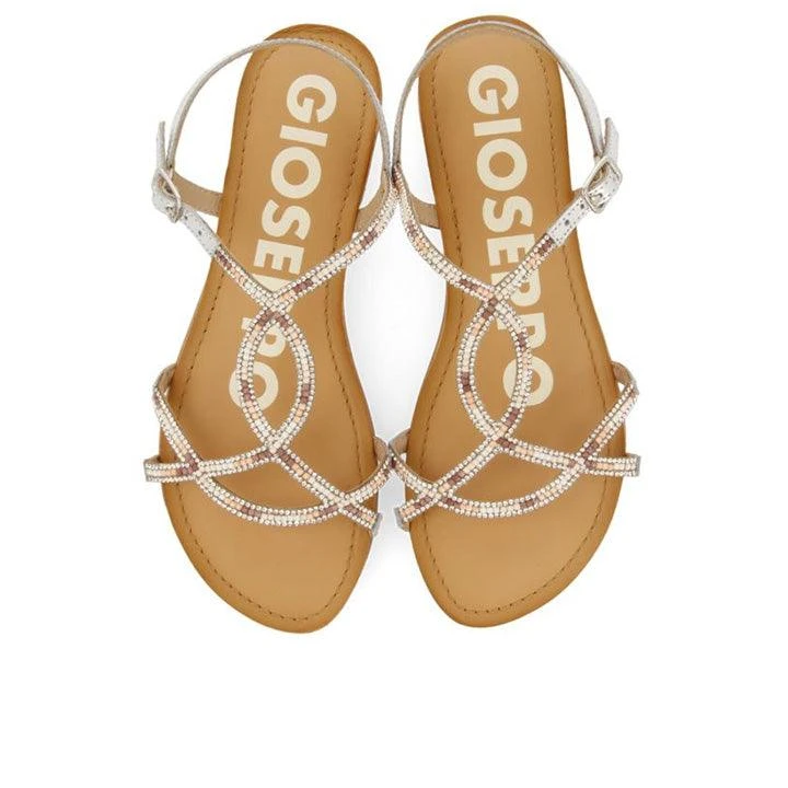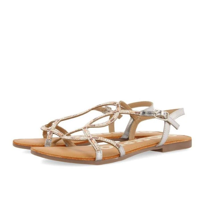 Leather sandals with thin metallic straps in silver color with multicolored ornament of pearls and brilliants. Ultra padded latex insole. Skin of the insole treated in a tannery using a more sustainable process, in accordance with Leather Working Group standards. Very flexible sole to guarantee maximum comfort. Your favorite sandals are waiting for you in the new Gioseppo Woman collection.