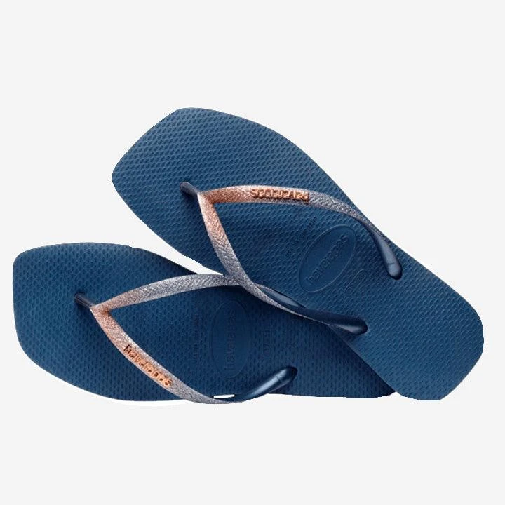 Havaianas Slim, loved all over the world, has a different version, more square, modern than ever! With the stripes with glitter in a gradient effect and the metallic logo, it will be a huge hit!